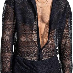 Men’s 2 Pieces Shirt Sets Lace See Through Long Sleeve Tracksuit