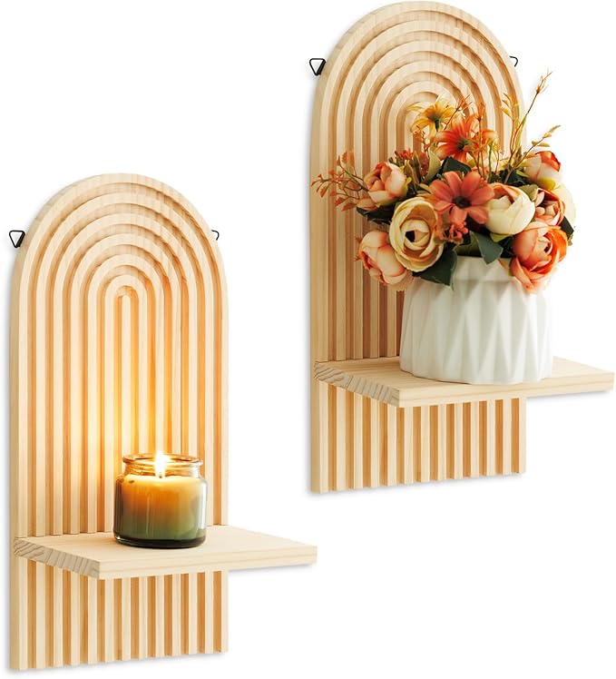 If you are looking for a wall floating shelves, you must consider this farmhouse wall décor. You can put any little décor ornaments for different space. Add candles, small flower vase and aromatherapy is not only perfect match for bedroom, living room, dining room, fireplace mantle, but also add rustic style for hallway, bathroom, staircase and other places. You can also choose some dolls for warm baby room. Our skilled artisans use high quality wood to create each wall décor. If you are looking for special gift for birthday, anniversary, housewarming, Christmas, Halloween, Thanksgiving, new year, you must consider this boho wall candle sconces set. Just use your infinite imagination to add ornaments on this wall floating shelves, you will definitely find different effects.