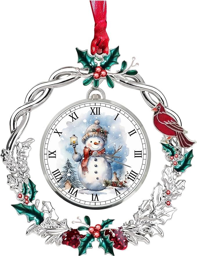 These Christmas Snowman Christmas Tree hanging Christmas Wreath ornament, Christmas Pendant Time Clock Decorative hanging Christmas Ornament Watch is made of alloy metal, Glass and Exquisite Crystals. The Size of Each Christmas cardinal ornament is 3.3×3.7×0.3 Inches. Christmas Wreath ornament Watch Pendant Time Decorations comes With a Ribbon that is easy to hang on the Christmas tree. Time Clock ornament features Red berries and green leaves Christmas wreath, enjoy this cute design Xmas ornament for your holidays decoration.