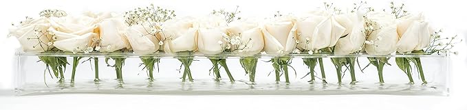 This sleek contemporary long Acrylic Floral Vase is exceptionally built and guarantees to stand out from the norm. Its unique aesthetic style goes beyond current trends and sets it apart from the common conventional design of tall vases for flower centerpieces for tables. Adds a touch of elegance and sophistication with its distinct style, making it a popular choice for parties, weddings, and modern home décor. Exhibit the intriguing visual effect of your most vibrant blooms with this unique modern décor. Create a striking contrast between the natural beauty of your flowers and the contemporary transparency of this flower vase. This 24-hole Acrylic Flower Vase provides clear visibility of your floral arrangements, making it a visually appealing focal point to any space.