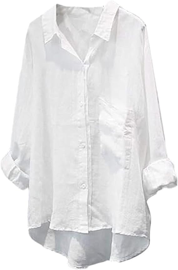 Cotton linen blouses plus size boyfriend shirts for women, One chest pocket, unique raw edge design, great for Spring, Summer, and Autumn. V-neck t-shirts for women, button-down sweatshirts, cuffed sleeve blouses with pockets, loose fitted, casual pullover top. This linen shirts women button down shirts blouse can be easily match with jeans, skinny leggings or shorts.